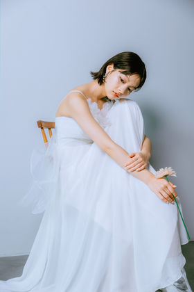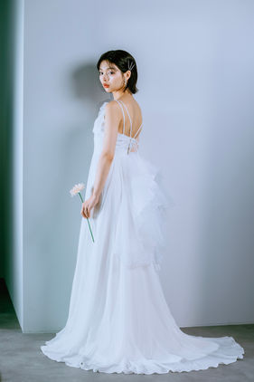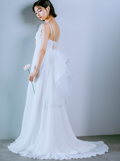 軽やかなシフォン生地が柔らかな印象を与えるデザイン。すっきりと開いたバックスタイルとボリュームたっぷりなフリルがアクセントに。後ろ姿までこだわりたい花嫁様におすすめ。(モデル身長:161cm)